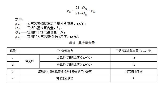 實測的工業爐窯排氣筒中大氣污染物排放濃度,應按以下公式換算為基準氧含量下的排放濃度,并以此濃度作為判定排放是否達標的依據。各類工業爐窯的基準氧含量按表5的規定執行。