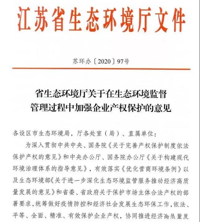 江蘇省生態環境廳已發布了《關于在生態環境監督管理中加強企業產權保護的意見》,通過不干擾守法企業保護企業產權。免除對標企業,全面禁止環境保護"一刀切“。