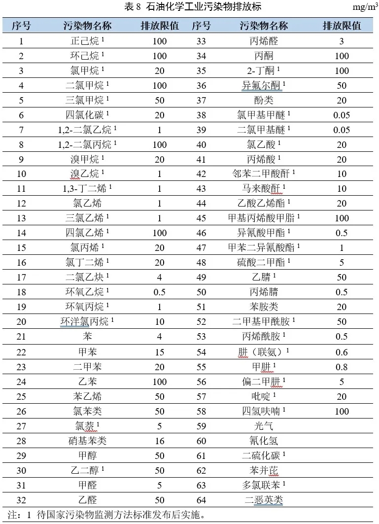 以石油餾分、天然氣等為原料,生產(chǎn)有機化學品、合成樹脂、合成纖維、合成橡膠等的工業(yè),執(zhí)行本標準。本標準是當前國家排放標準中涉VOC特征因子最多的排放標準。但大多數(shù)因子國家還未發(fā)布相關檢測方法。