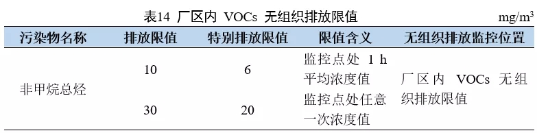 本標準規(guī)定了 VOCs物料儲存無組織排放控制要求、VOCs物料轉移和輸送無組織排放控制要求、工藝過程 VOCs無組織排放控制要求、設備與管線組件 VOCs 泄漏控制要求、敞開液面 VOCs無組織排放控制要求,以及VOCs無組織排放廢氣收集處理系統(tǒng)要求、企業(yè)廠區(qū)內(nèi)及周邊污染監(jiān)控要求。標準適用于涉及 VOCs無組織排放的現(xiàn)有企業(yè)或生產(chǎn)設施的 VOCs無組織排放管理,以及涉及VOCs無組織排放的建設項目的環(huán)境影響評價、環(huán)境保護設施設計、竣工環(huán)境保護驗收、排污許可證核發(fā)及其投產(chǎn)后的 VOCs無組織排放管理。標準主要對無組織管控提出要求,在限值方面,強調(diào)了廠區(qū)內(nèi) VOCs 無組織排放的限值要求,見下表。該標準已于 2020 年 7 月 1 日起全面實施。