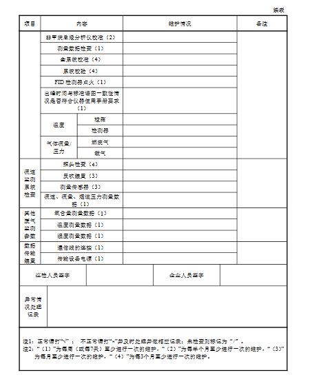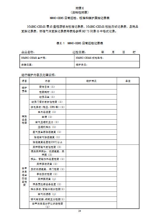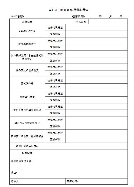 11.3定期維護(hù)維護(hù)頻次按照本標(biāo)準(zhǔn)附表E.1進(jìn)行,定期維護(hù)應(yīng)做到:a)使用氫氣鋼瓶時(shí),至少每周巡檢一次鋼瓶氣的壓力并記錄,有條件的應(yīng)做到一用一備;b)使用氫氣發(fā)生器時(shí),至少每周檢查一次氫氣發(fā)生器變色硅膠的變色 情況,超過2/3變色應(yīng)及時(shí)更換變色硅膠;c)使用氫氣發(fā)生器時(shí),應(yīng)按其說(shuō)明書規(guī)定,定期檢查氫氣壓力、氫氣發(fā)生器電解液等,根據(jù)使用情況及時(shí)更換,定期添加純凈水;d)至少每周檢查一次除烴裝置溫度是否保持在350°C以上;e)至少每周檢查一次出峰時(shí)間與標(biāo)準(zhǔn)譜圖一致性情況是否符合儀器使用手冊(cè)要求;f)至少每月檢查一次燃燒氣連接管路的氣密性,NMHC-CEMS的過濾器、采樣管路的結(jié)灰情況,若發(fā)現(xiàn)數(shù)據(jù)異常應(yīng)及時(shí)維護(hù);g)至少每半年檢查一次零氣發(fā)生器中的活性炭和NO氧化劑,根據(jù)使用情況進(jìn)行更換;h)使用催化氧化裝置的NMHC-CEMS至少每年用丙烷標(biāo)氣檢驗(yàn)一次轉(zhuǎn)化效率,保證丙烷轉(zhuǎn)化效率在95%以上,否則應(yīng)更換催化氧化裝置;i)更換主要部件如色譜柱、定量環(huán)時(shí)需對(duì)分析儀進(jìn)行多點(diǎn)校準(zhǔn),并記錄校準(zhǔn)數(shù)據(jù)和過程,校準(zhǔn)數(shù)據(jù)符合本標(biāo)準(zhǔn)表1要求且穩(wěn)定后才可投入運(yùn)行;j)定期維護(hù)記錄按本標(biāo)準(zhǔn)附錄E中表格形式記錄。