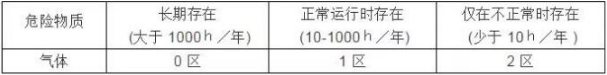 按場所中危險物質(zhì)存在時間的長短,將兩類不同物態(tài)下的危險場所劃分為三個區(qū),即:對爆炸性氣體環(huán)境,為0區(qū)、1區(qū)和2區(qū);對可燃性粉塵環(huán)境,為20區(qū)、21區(qū)和22區(qū)。