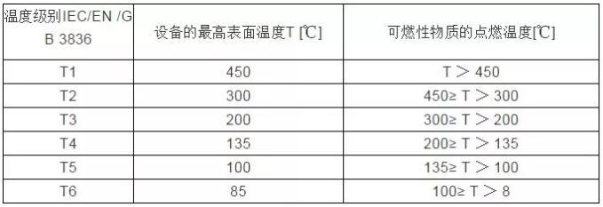 電氣設(shè)備按其最高表面溫度分為T1~T6組,使得對應的T1~T6組的電氣設(shè)備的最高表面溫度不能超過對應的溫度組別的允許值。溫度組別、設(shè)備表面溫度和可燃性氣體或蒸汽的引燃溫度之間的關(guān)系如下表所示: