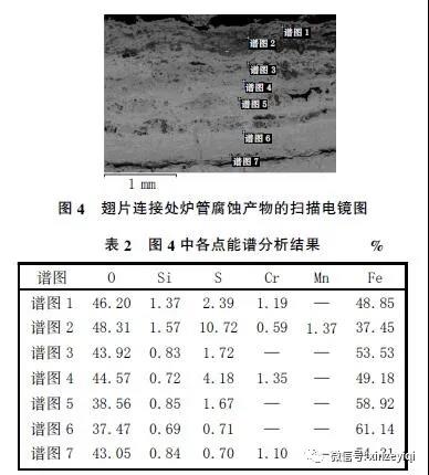 對翅片連接處爐管腐蝕產(chǎn)物進(jìn)行了掃描電鏡及能譜分析,結(jié)果見圖4 和表2。由圖4 和表2 可知,腐蝕產(chǎn)物中O 元素質(zhì)量分?jǐn)?shù)較高,且沿徑向方向由內(nèi)到外大致呈降低趨勢,由48%降至37%;腐蝕產(chǎn)物中存在一定量的S 元素,且存在硫富集帶,其S 元素質(zhì)量分?jǐn)?shù)高達(dá)10%(譜圖2)。以上分析表明,爐管存在嚴(yán)重氧化現(xiàn)象以及不同程度的硫腐蝕。