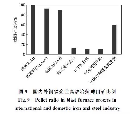 噸球團礦的SO2和NOx排放量僅為燒結礦的約1/2和1/3,提高高爐入爐原料中球團礦比例,有利于實現鋼鐵行業硫硝源頭減排。目前,國內外鋼鐵企業高爐冶煉球團礦比例如圖9所示。歐美國家的高爐球團礦比例普遍在90%以上,瑞典SSAB廠為100%全球團冶煉,墨西哥Monclova廠為93%,美國Ashland廠為90%。亞洲國家高爐球團礦占比普遍較低:韓國浦項光陽廠為12%,日本新日鐵為10%,中國河鋼集團平均為10%,主要是因為球團礦的堿度較低(堿度為0.1~0.2)。