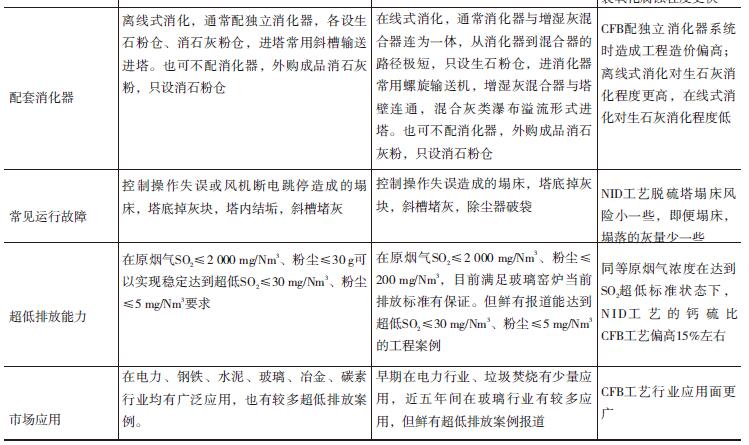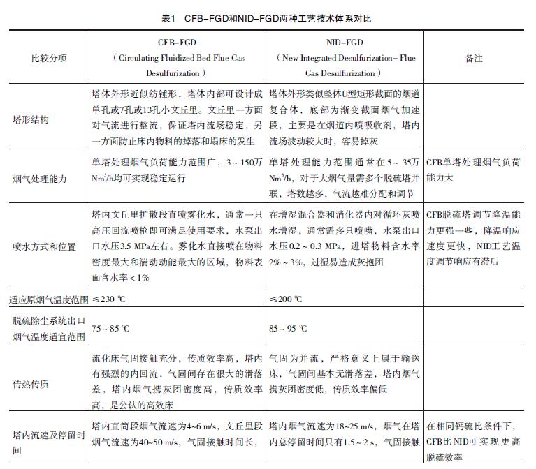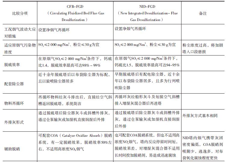 煙氣循環(huán)流化床CFB-FGD、 NID-FGD兩種半干法脫硫除塵治理工藝技術(shù)體系對比見表1。